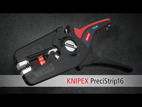 KNIPEX PreciStrip16® 12 52 195, Automatic insulation stripper. Simple, precise stripping of fine wires and solid round cables with a wide capacity range from 0.08 to 16 mm² with only one pair of pliers. Good grip provided by semi-circular grooved metal holding clamps, exact cut thanks to parabolic stripping blade. An automatism regulates the depth of the cut; the neutral point of the automatism can be adjusted in fine steps in special operating conditions (insulation material, temperature). Additionally available: Blade block (12 49 32) for very hard halogen-free cables from 4 – 16 mm². With adjustable length stop for precision work repeated accurately each time. Inscription area for customization. Comfortable operation with ergonomic dual-component handle. With tether attachment point, suitable for KNIPEX Tethered Tools accessories. Easily replaceable blade cassette. With cable cutter on top for copper and aluminum conductors, flexible up to 10 mm² (AWG 8), solid up to 6 mm² (AWG 10).